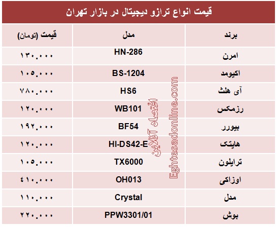 اقتصاد آنلاین- مریم علیائی: قیمت انواع ترازو دیجیتال در بازار تهران به شرح جدول زیر است‎:‎
