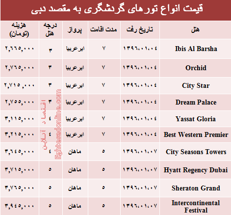 سمانه فتح آبادی: قیمت انواع تورهای گردشگری به مقصد دوبی، در نوروز 96 به شرح جدول زیر است؛