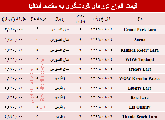 سمانه فتح آبادی: قیمت انواع تورهای گردشگری به مقصد آنتالیا در کشور ترکیه، در نوروز 96 به شرح جدول زیر است؛