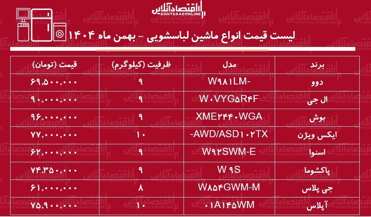 قیمت جدید انواع ماشین لباسشویی در بازار / ماشین لباسشویی بوش، ال جی، اسنوا و....چند شد؟ + جدول بهمن ماه ۱۴۰۴