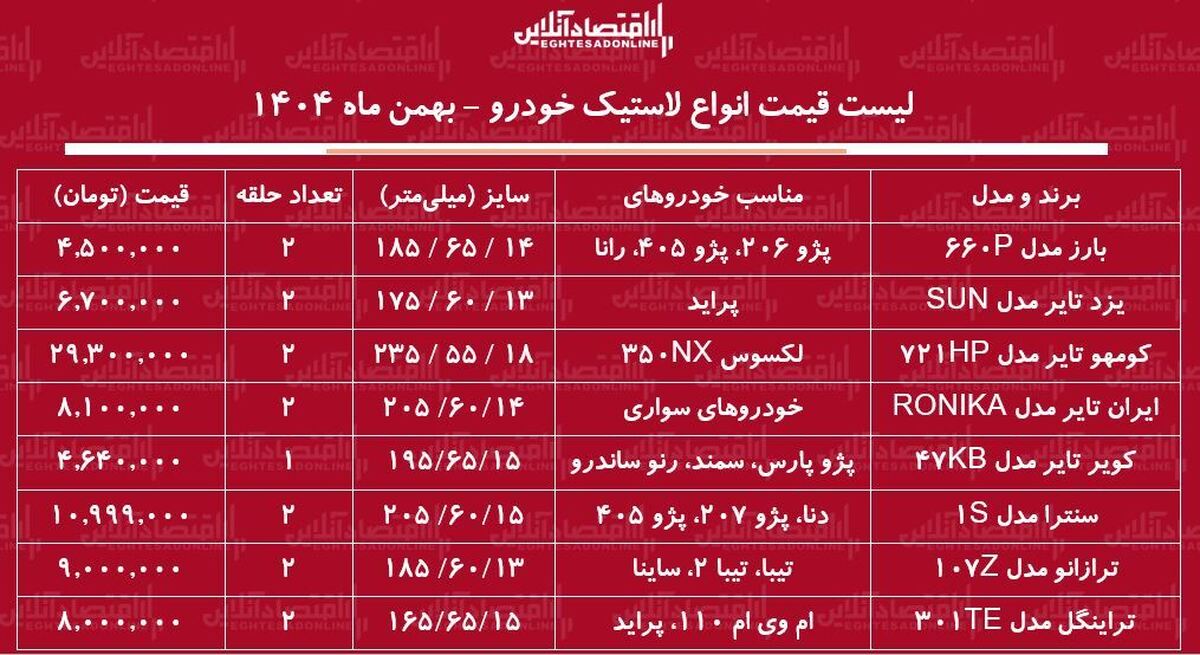 جدیدترین قیمت انواع لاستیک خودرو در بهمن ماه ۱۴۰۴ را در این گزارش بخوانید.