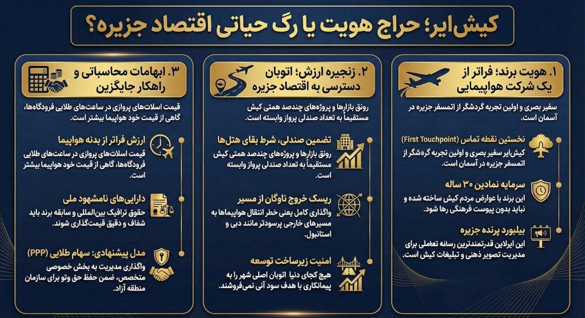 در دنیای مدرنِ گردشگری، ایرلاین اختصاصی یک مقصد، صرفاً یک وسیله حملونقل نیست؛ بلکه «نخستین نقطه تماس» (First Touchpoint) و قدرتمندترین رسانه تعاملی آن منطقه است. کیشایر، سفیر بصری و هویت برند جزیره در آسمان کشور است. واگذاری صددرصدی این شرکت به جریانی که صرفاً نگاه ترازنامهای دارد، به معنای سپردنِ «مدیریت تصویر و هویت کیش» به دست افرادی است که تعهدی به استراتژیهای کلان تبلیغاتی و گردشگری جزیره ندارند. ما نمیتوانیم میلیاردها تومان صرف تبلیغات محیطی برای جذب توریست کنیم، اما اختیار پروازی که قرار است آن توریست را بیاورد، در دست نداشته باشیم.