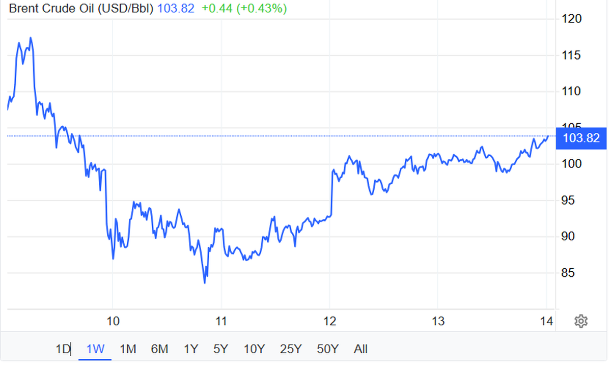 به گزارش اقتصادآنلاین، دادههای تریدینگ اکونومیکس نشان میدهد، قیمت هر بشکه نفت برنت (در لحظه انتشار گزارش) در محدوده ۱۰۳ دلار در نوسان است.