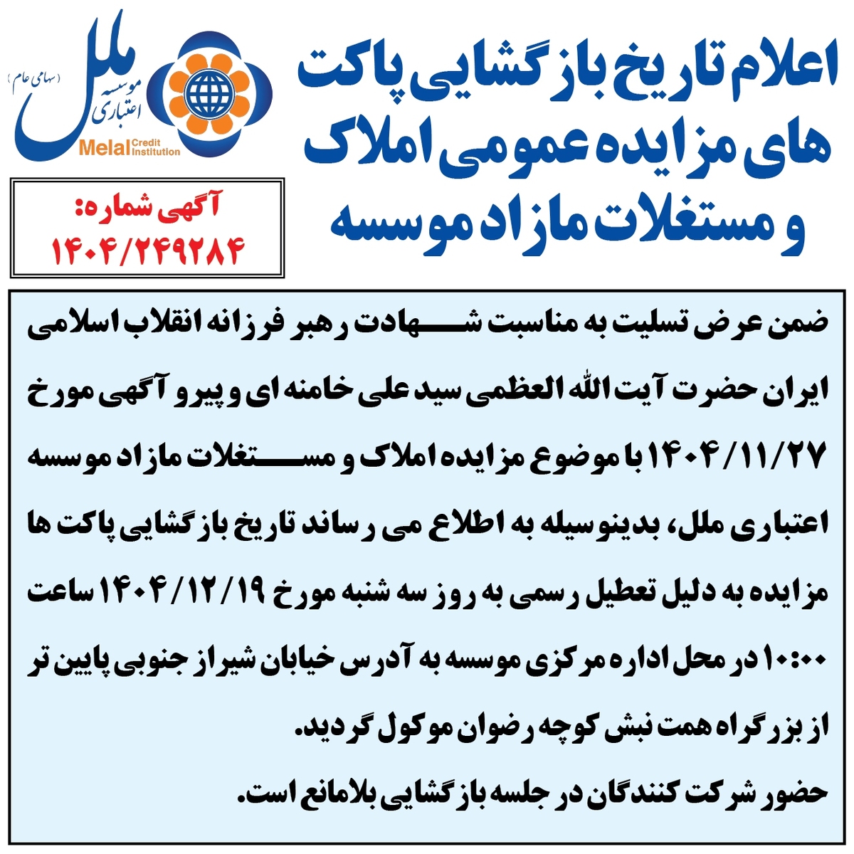 اعلام تاریخ بازگشایی پاکت های مزایده عمومی املاک و مستغلات مازاد موسسه