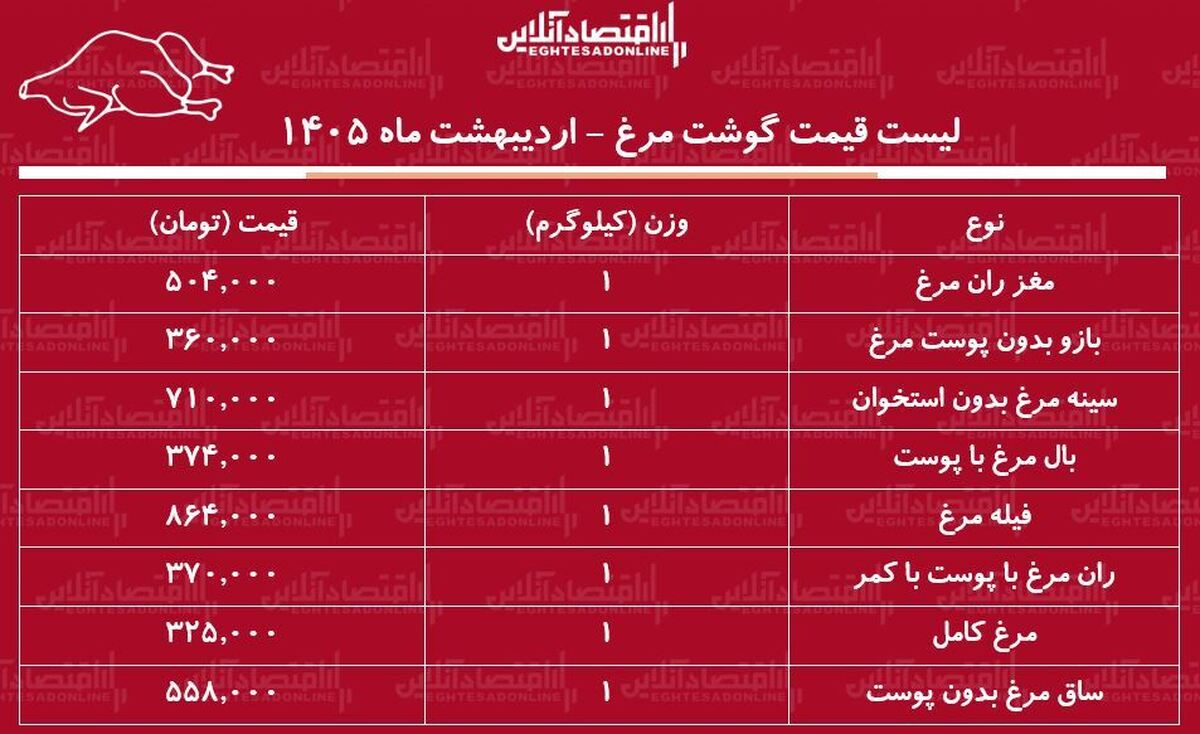 لیست قیمت گوشت مرغ امروز ۵ اردیبهشت ۱۴۰۵ / ران مرغ کیلویی چند شد؟ + جدول