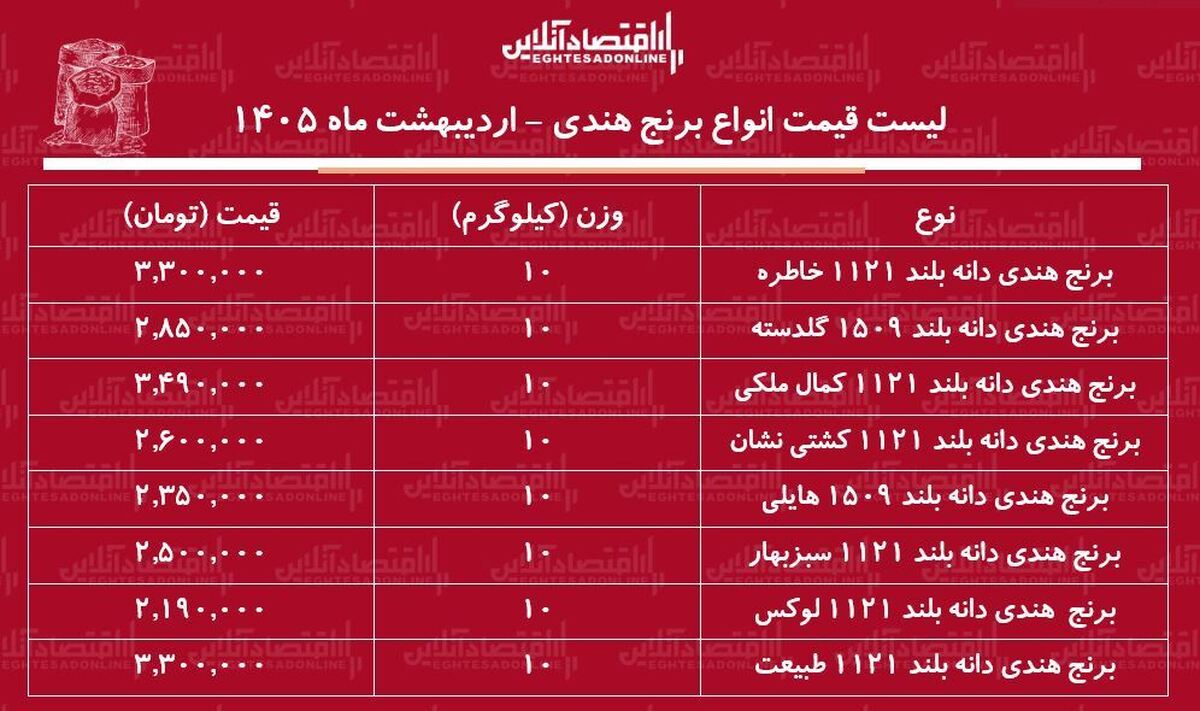 «برنج هندی دانه بلند ۱۱۲۱ کمال ملکی» به وزن ۱۰ کیلوگرم با قیمت ۳ میلیون و ۴۹۰ هزار تومان به فروش میرسد. همچنین، «برنج هندی دانه بلند ۱۵۰۹ گلدسته» به ازای هر ۱۰ کیلوگرم با قیمت ۲ میلیون و ۸۵۰ هزار تومان عرضه میشود.