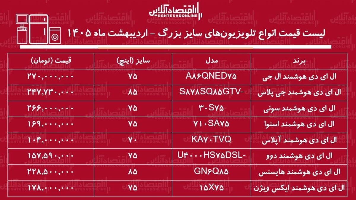 قیمت جدید انواع تلویزیونهای سایز بزرگ در بازار / ال ای دی ۷۵ اینچ ال جی، دوو، سونی، اسنوا و...چند شد؟ + جدول اردیبهشت ماه ۱۴۰۵