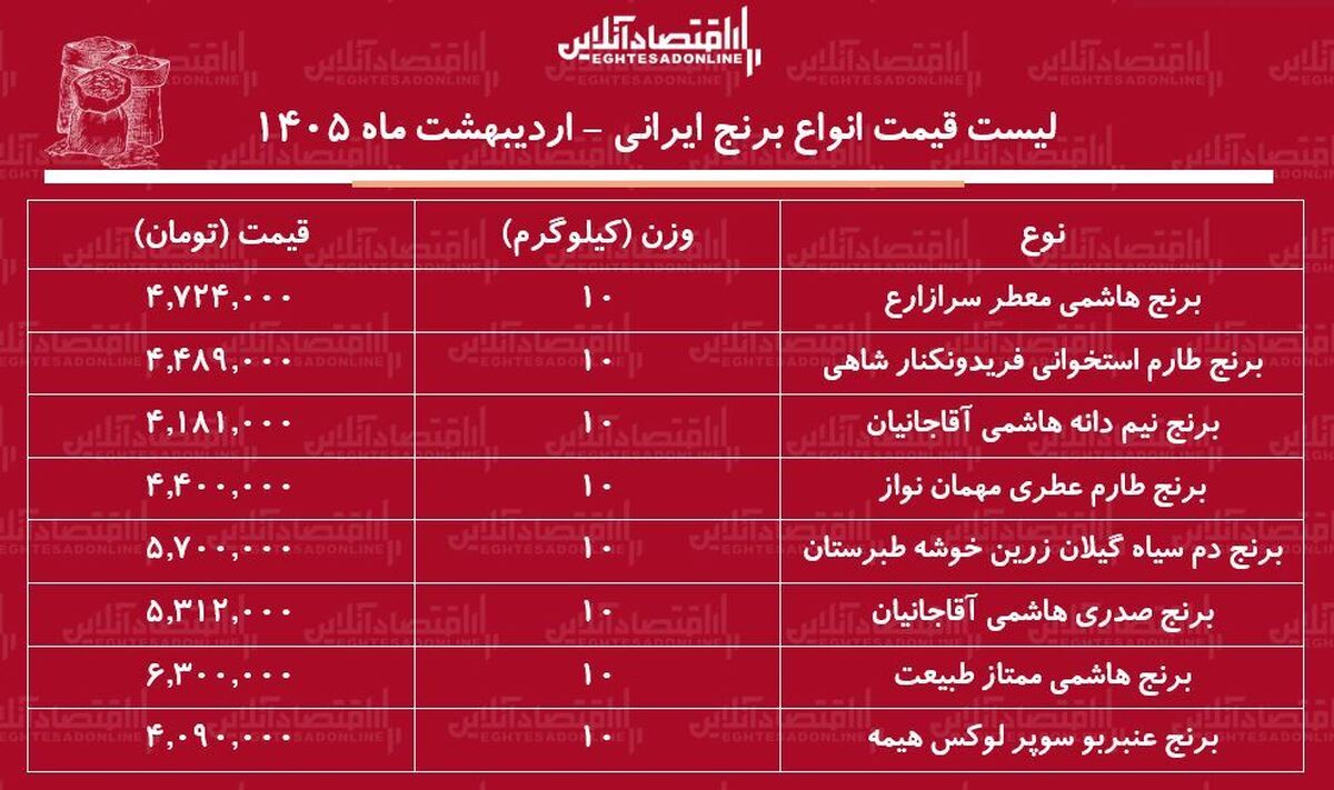 «برنج هاشمی معطر سرازارع» که از انواع پرطرفدار با عطر ملایم و دانه بلند است، به ازای هر ۱۰ کیلوگرم با قیمت ۴ میلیون و ۷۲۴ هزار تومان در بازار موجود است.