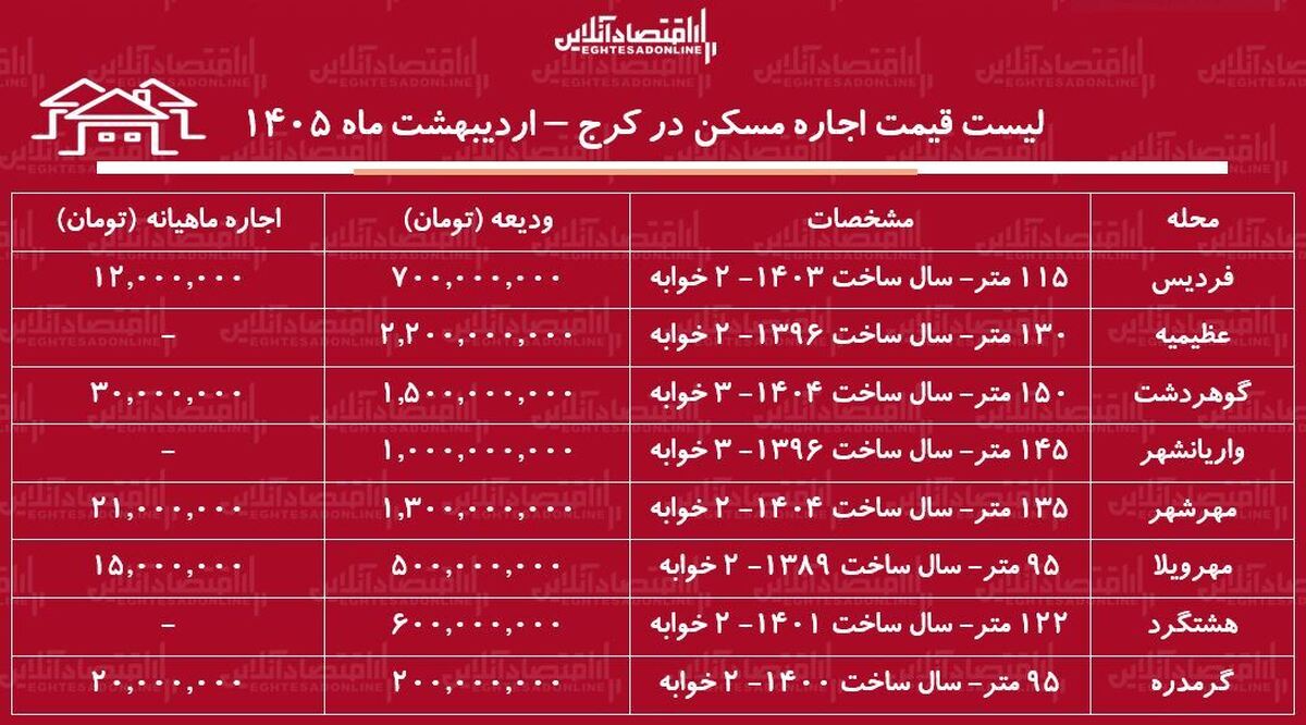 لیست قیمت اجاره مسکن در کرج / رهن و اجاره آپارتمان ۲ خوابه در این منطقه چقدر است؟ + جدول اردیبهشت ماه ۱۴۰۵