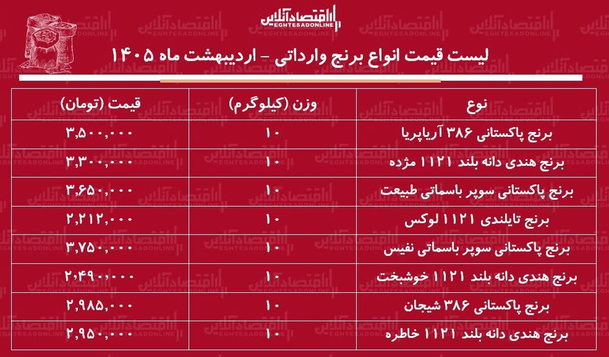 کیسه ۱۰ کیلویی «برنج هندی دانه بلند ۱۱۲۱ خاطره» نیز با قیمت ۲ میلیون ۹۵۰ هزار تومان عرضه می‌شود. همچنین، «برنج هندی دانه بلند ۱۱۲۱ مژده» به وزن ۱۰ کیلوگرم با قیمت ۳ میلیون و ۳۰۰ هزار تومان در دسترس مصرف‌کنندگان قرار دارد.