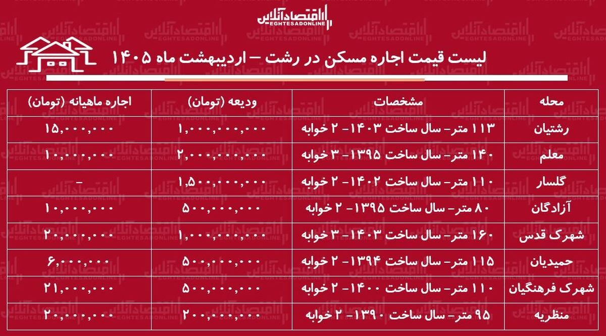 لیست قیمت اجاره مسکن در رشت / اجاره آپارتمان ۱۰۰ متری در محلات مختلف رشت چقدر هزینه دارد؟ + جدول اردیبهشت ماه ۱۴۰۵