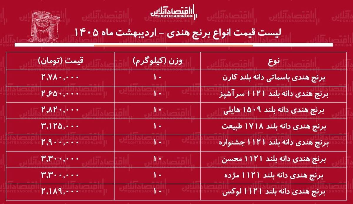 همچنین، قیمت «برنج هندی دانه بلند ۱۵۰۹ هایلی» به ازای هر ۱۰ کیلوگرم به ۲ میلیون و ۸۲۰ هزار تومان رسیده است.