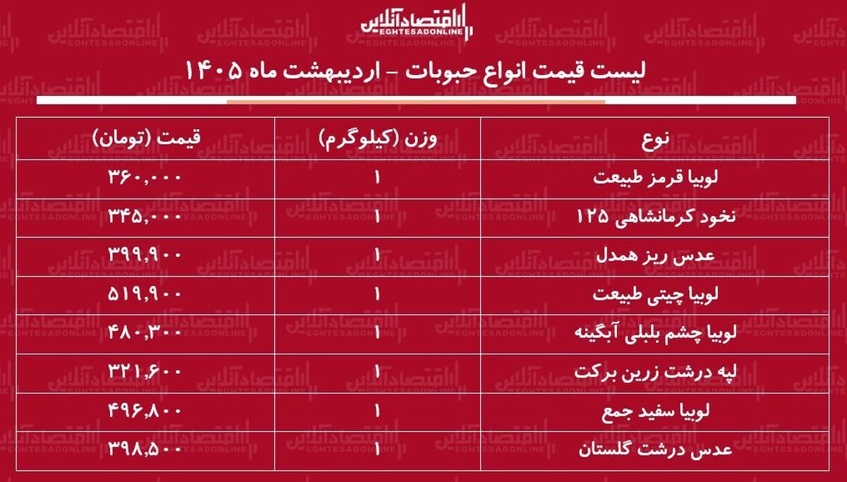 قیمت جدید انواع حبوبات در اردیبهشت ماه ۱۴۰۵ را در این گزارش بخوانید.