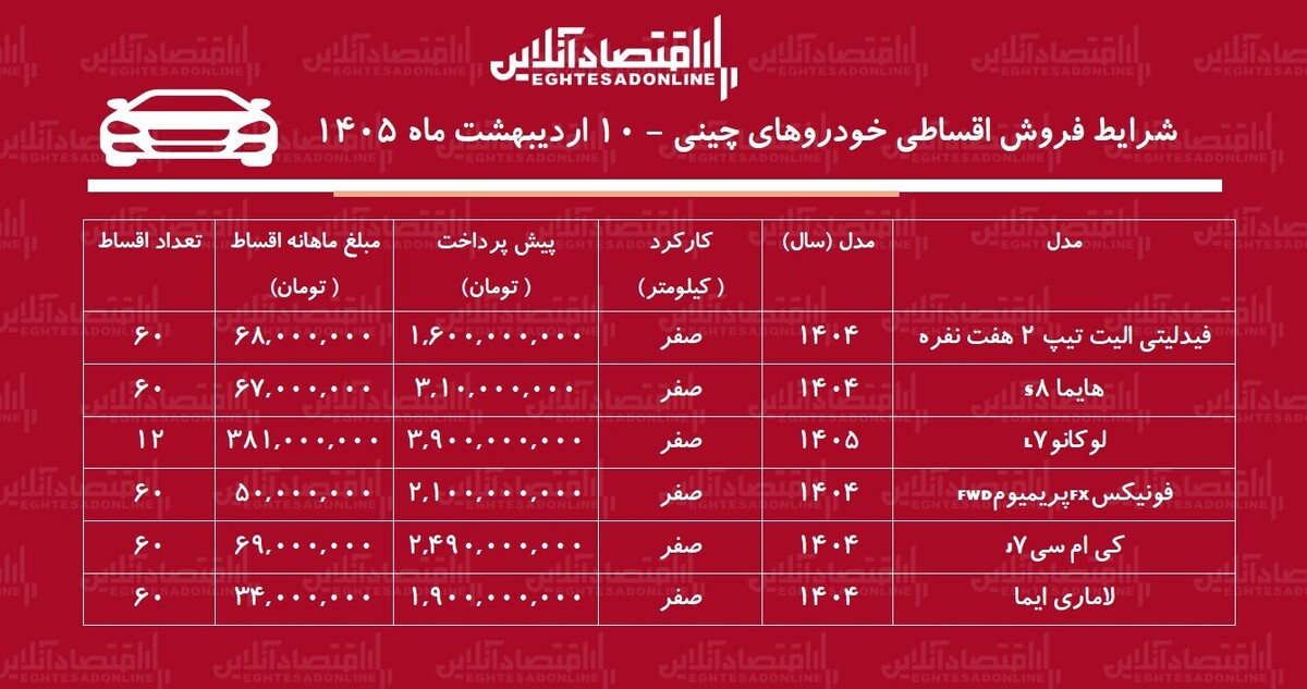 به گزارش سرویس خودرو اقتصادآنلاین، براساس آگهی های منتشر شده از فروش اقساطی خودروهای چینی در نمایشگاه های شخصی خودرو، فیدلیتی الیت تیپ ۲ هفتنفره با پیشپرداخت یک میلیارد و ۶۰۰ میلیون تومان و اقساط ماهیانه ۶۸ میلیون تومان در بازه ۶۰ ماهه عرضه میشود.