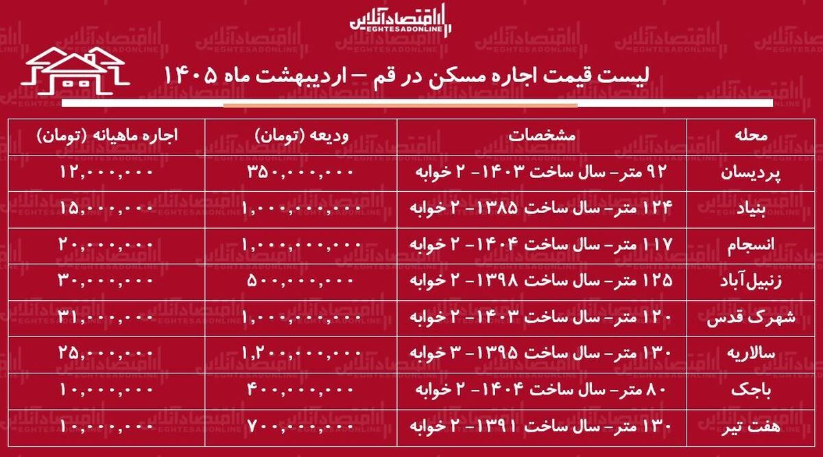 لیست قیمت اجاره مسکن در قم / اجاره آپارتمان ۲ خوابه در پردیسان، بنیاد، انسجام و...چقدر سرمایه نیاز دارد؟ + جدول اردیبهشت ماه ۱۴۰۵