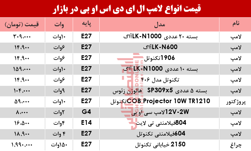 اقتصاد آنلاین - سمانه باقری : آنچه در زیر می آید جدول قیمت روز پرفروش‌ترین لامپ‌های LED COB در سطح بازار تهران است؛