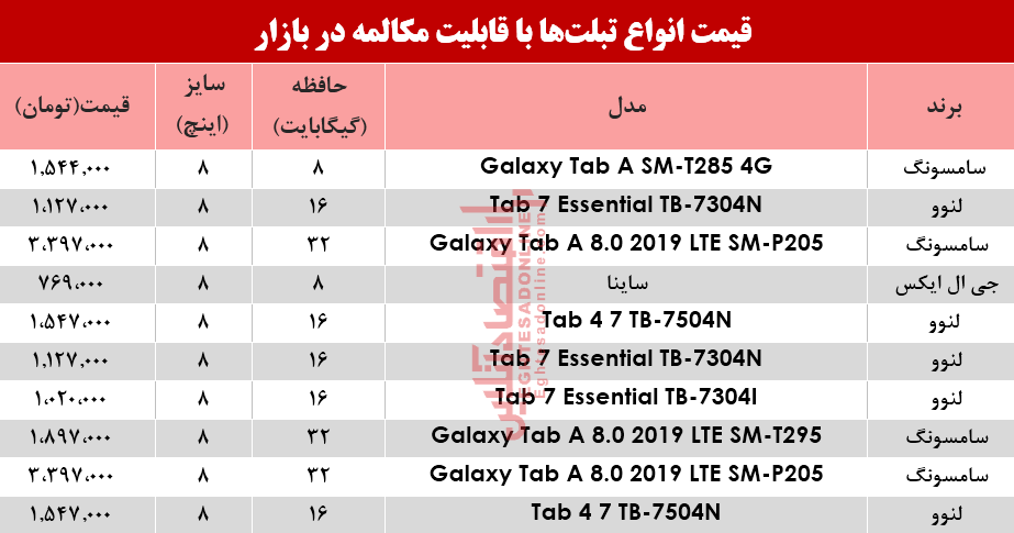 نرخ انواع تبلت با قابلیت مکالمه در بازار؟ +جدول