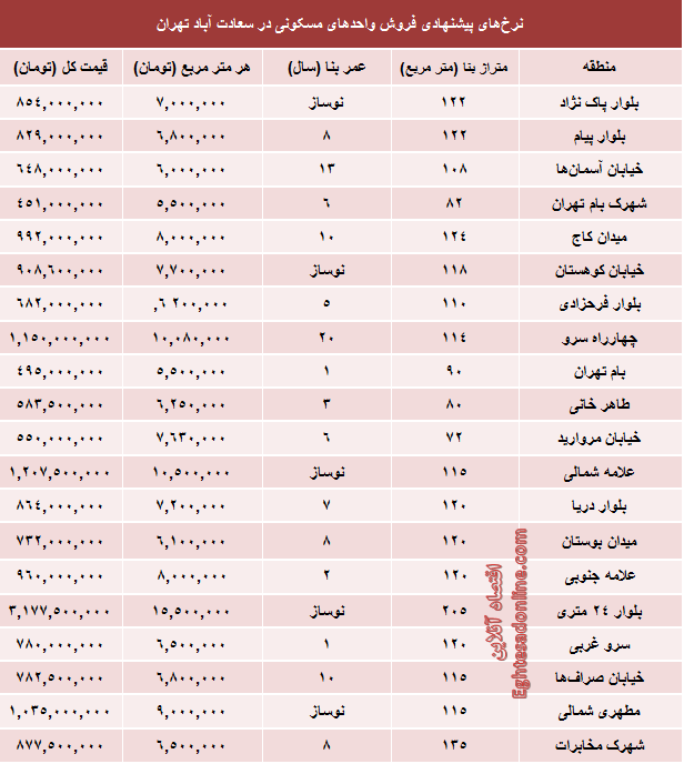 به گزارش اقتصاد آنلاین، آنچه در زیر می آید جدول قیمت روز انواع آپارتمان های واقع در سعادت آباد تهران است؛