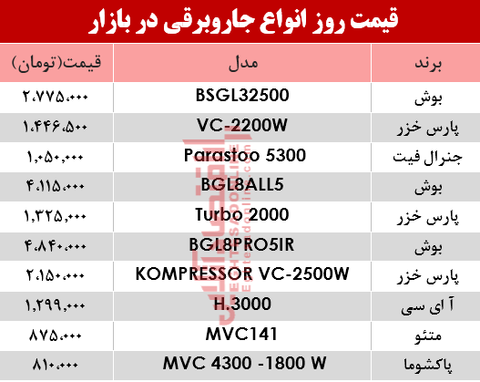 اقتصاد آنلاین - بهروز طاهری : آنچه در زیر می آید جدول قیمت انواع جاروبرقی دربازار تهران است: شایان ذکر است که این نرخها ممکن است بر اساس برخی امکانات جانبی و خدمات پس از فروش در مناطق مختلف شهر تا 10 درصد تفاوت قیمت داشته باشد.