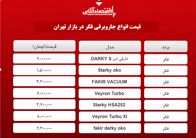 اقتصاد آنلاین -سمانه‌ باقری: آنچه در زیر می‌آید جدول قیمت روز انواع جاروبرقی‌ برند فکر در سایت‌های فروش اینترنتی است؛