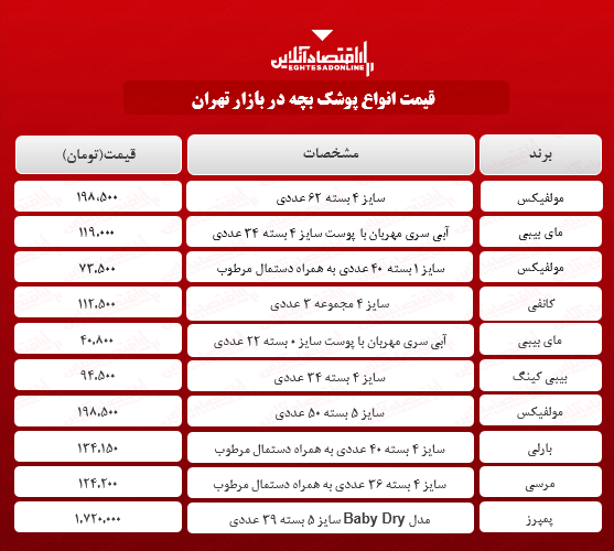 اقتصاد آنلاین - سمانه‌ باقری: آنچه در زیر می‌آید جدول قیمت روز انواع پوشک بچه در سایت‌های فروش اینترنتی است؛