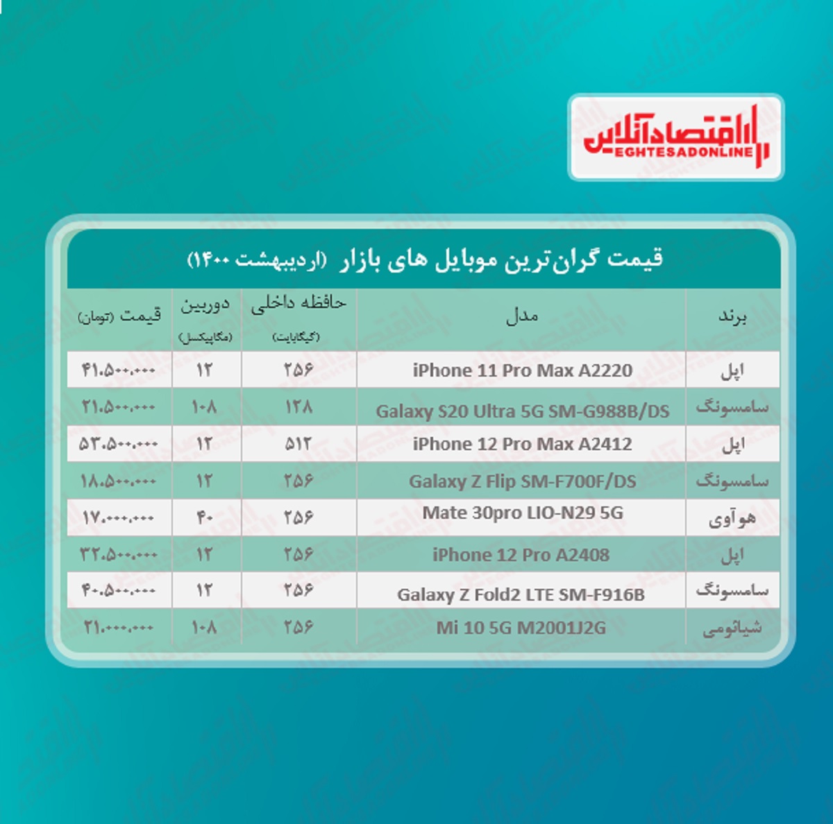 اقتصاد آنلاین- پیام مصطفایی، قیمت گرانترین موبایلها در بازار تهران به شرح جدول زیر است: