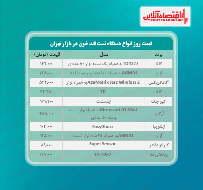 اقتصاد آنلاین -سمانه‌ باقری: آنچه در زیر می‌آید جدول قیمت روز انواع دستگاه تست قند خون در سایت‌های فروش اینترنتی است؛