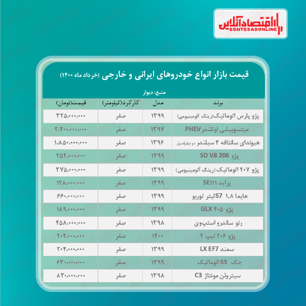 اقتصاد آنلاین - پیام مصطفایی: در جدول زیر قیمت روز انواع خودروهای ایرانی و خارجی را در بازار آزاد مشاهده میکنید.
