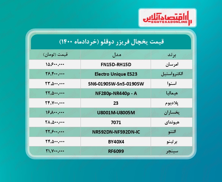 اقتصاد آنلاین - سولماز محمدی: آنچه در زیر میآید قیمت یخچال فریزر دوقلو در سطح بازار است؛