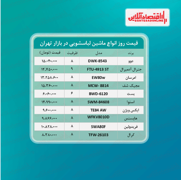 اقتصاد آنلاین - سمانه باقری :آنچه در زیر می‌آید جدول قیمت روز انواع جدید ترین مدل‌های ماشین لباسشویی در سایت‌های فروش اینترنتی است؛