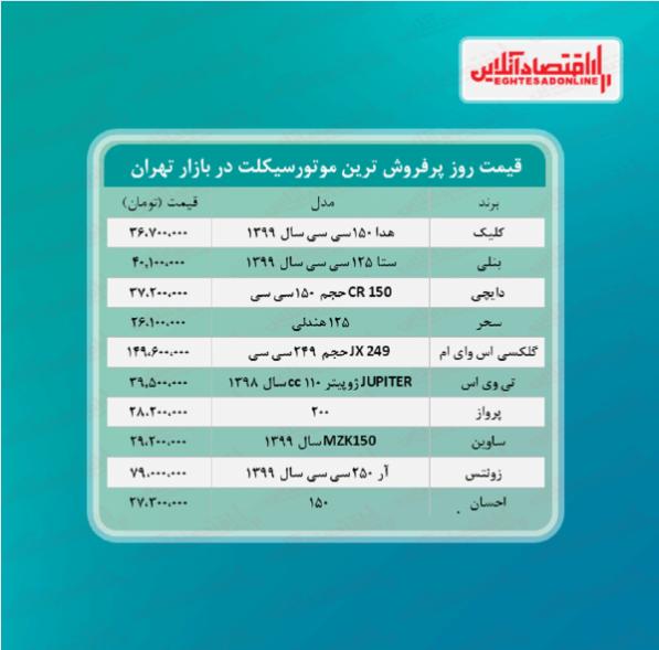 اقتصادآنلاین – سمانه باقری: آنچه در زیر می‌آید قیمت پرفروش ترین انواع موتورسیکلت‌ در سطح بازار تهران به شرح جدول زیر است؛
