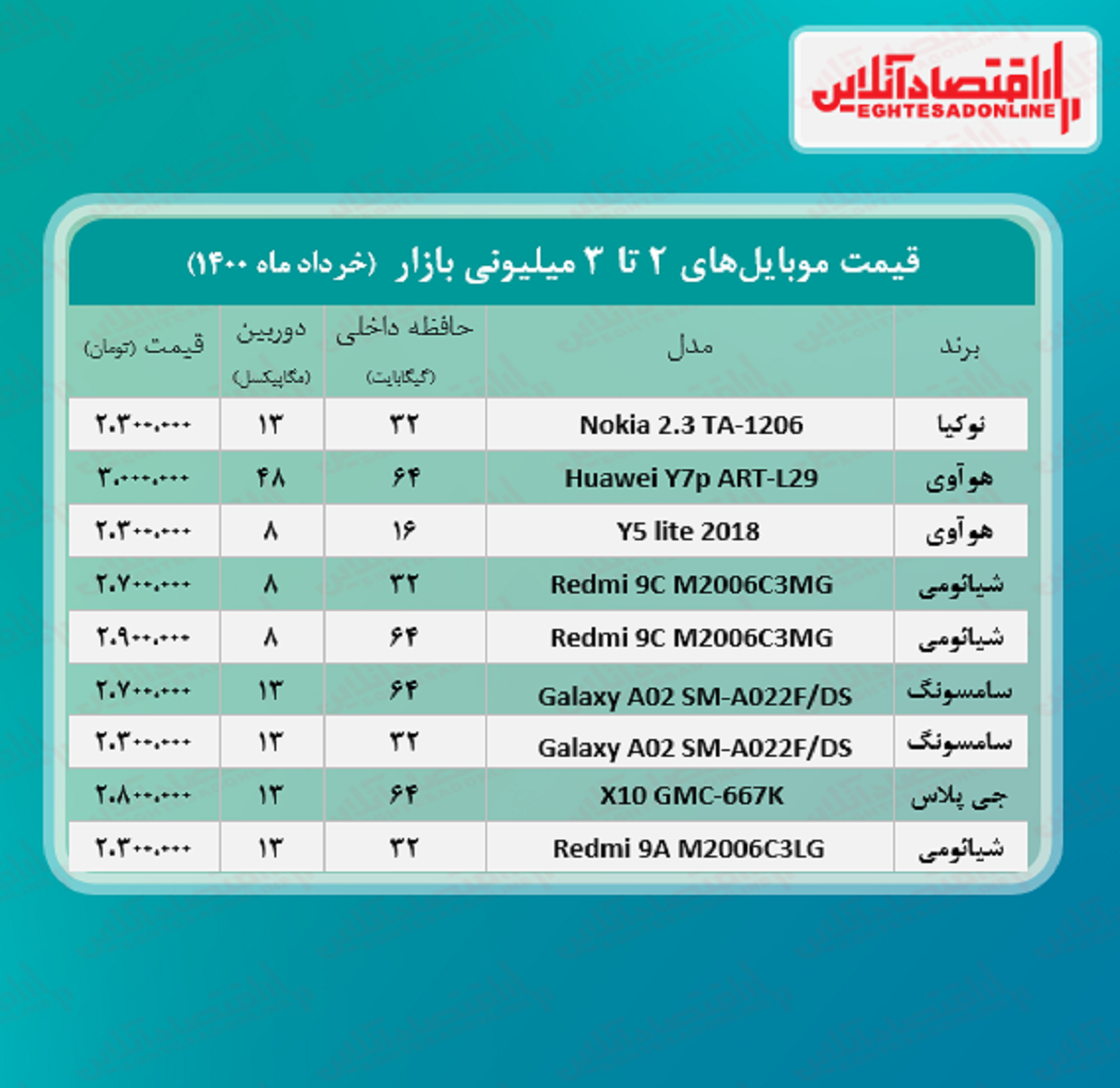 اقتصاد آنلاین – فائزه بهرامی: آنچه در زیر می‌آید قیمت انواع موبایل 2تا 3میلیونی در سطح بازار تهران است؛