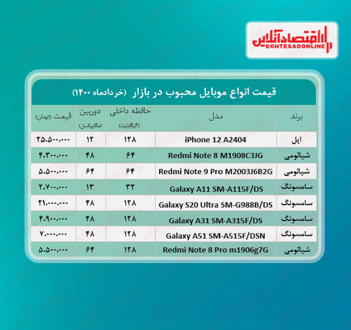 اقتصاد آنلاین- فائزه بهرامی، قیمت محبوب‌ترین موبایل‌ها در بازار تهران به شرح جدول زیر است‎: