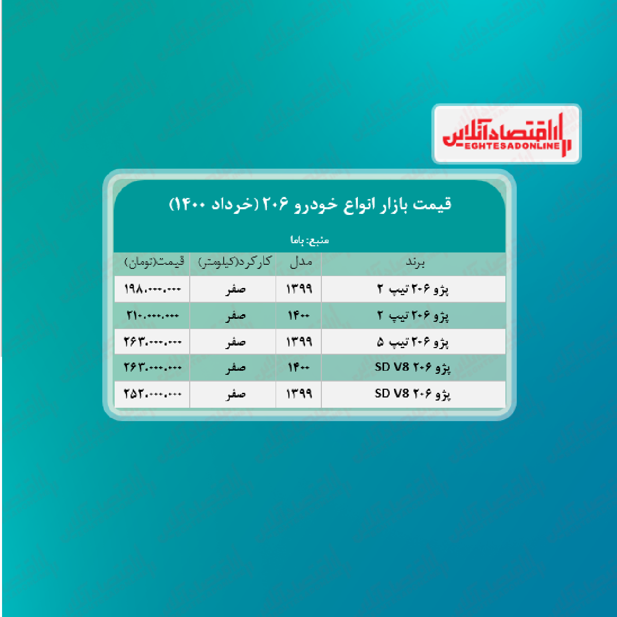اقتصاد آنلاین - پیام مصطفایی: در جدول زیر قیمت روز انواع خودرو 206 در بازار آزاد را مشاهده میکنید.
