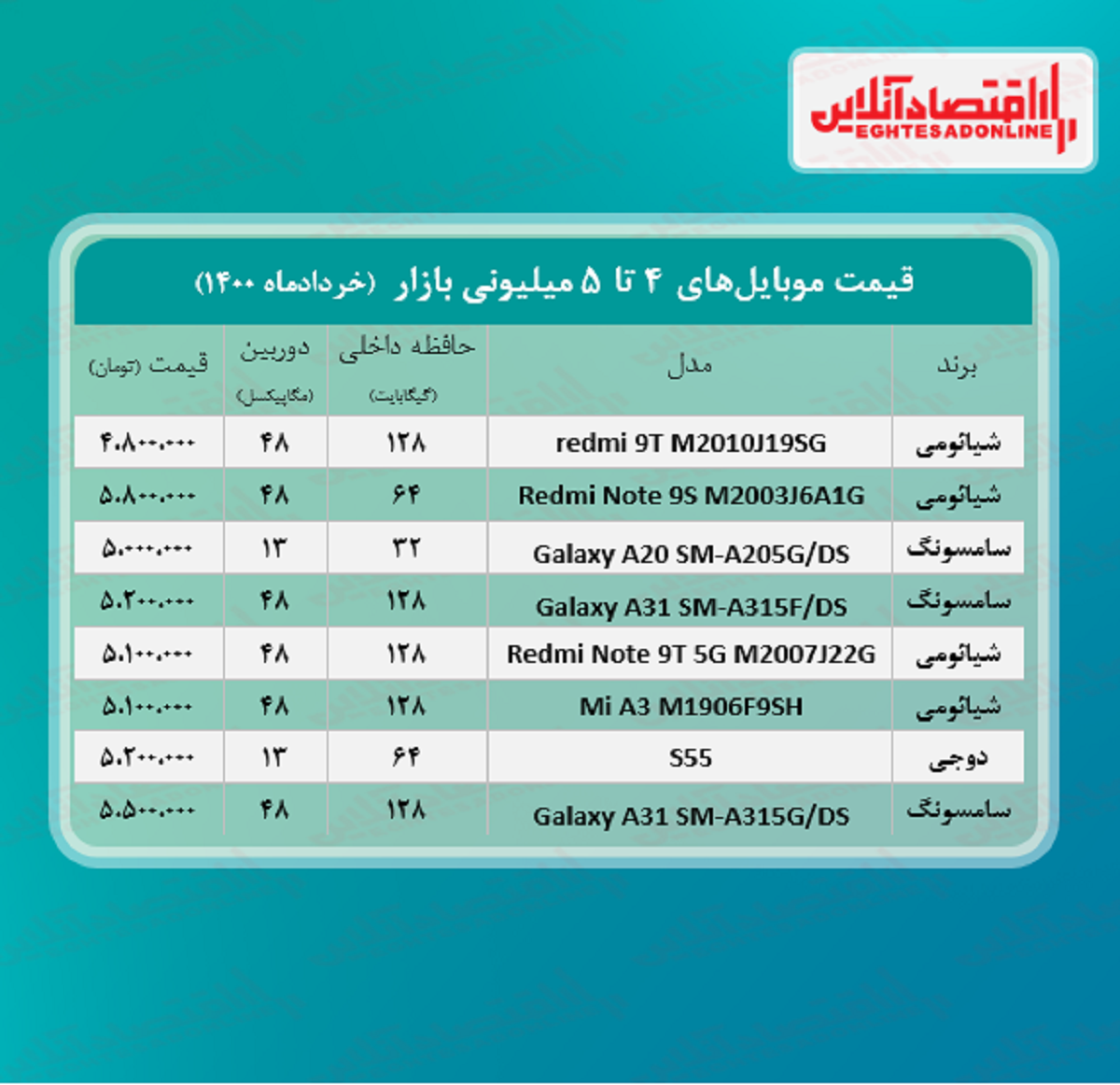 اقتصاد آنلاین – فائزه بهرامی: آنچه در زیر میآید قیمت انواع موبایل 4تا 5میلیونی در سطح بازار تهران است؛