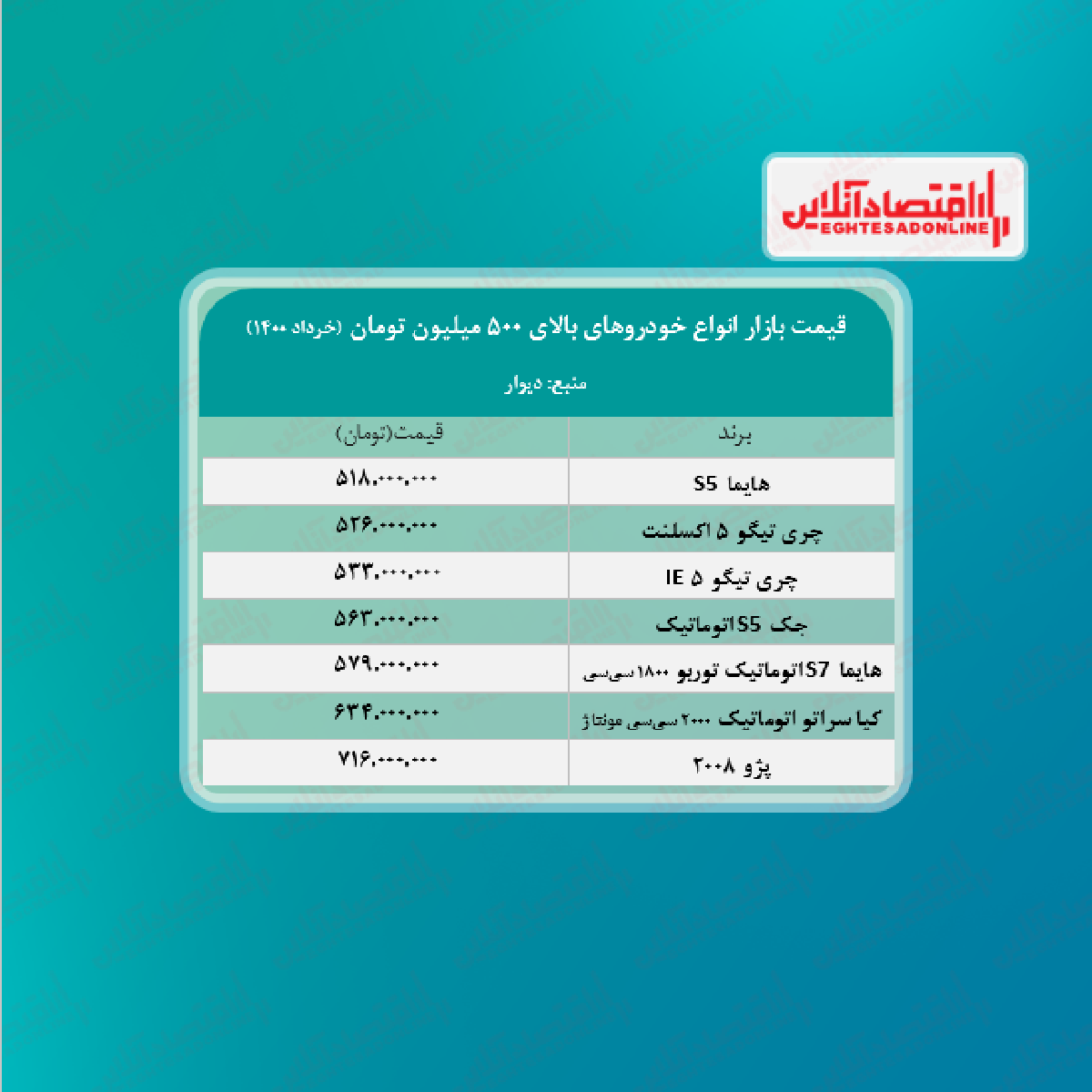 انواع خودروهای بالای ۵۰۰ میلیون تومان + جدول