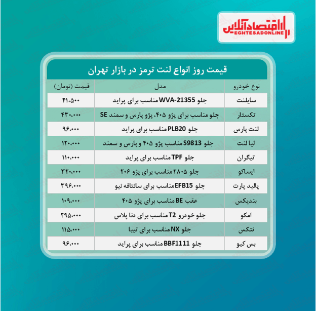 اقتصاد آنلاین -سمانه‌ باقری: آنچه در زیر می‌آید جدول قیمت روز انواع لنت ترمز در سایت‌های فروش اینترنتی است؛