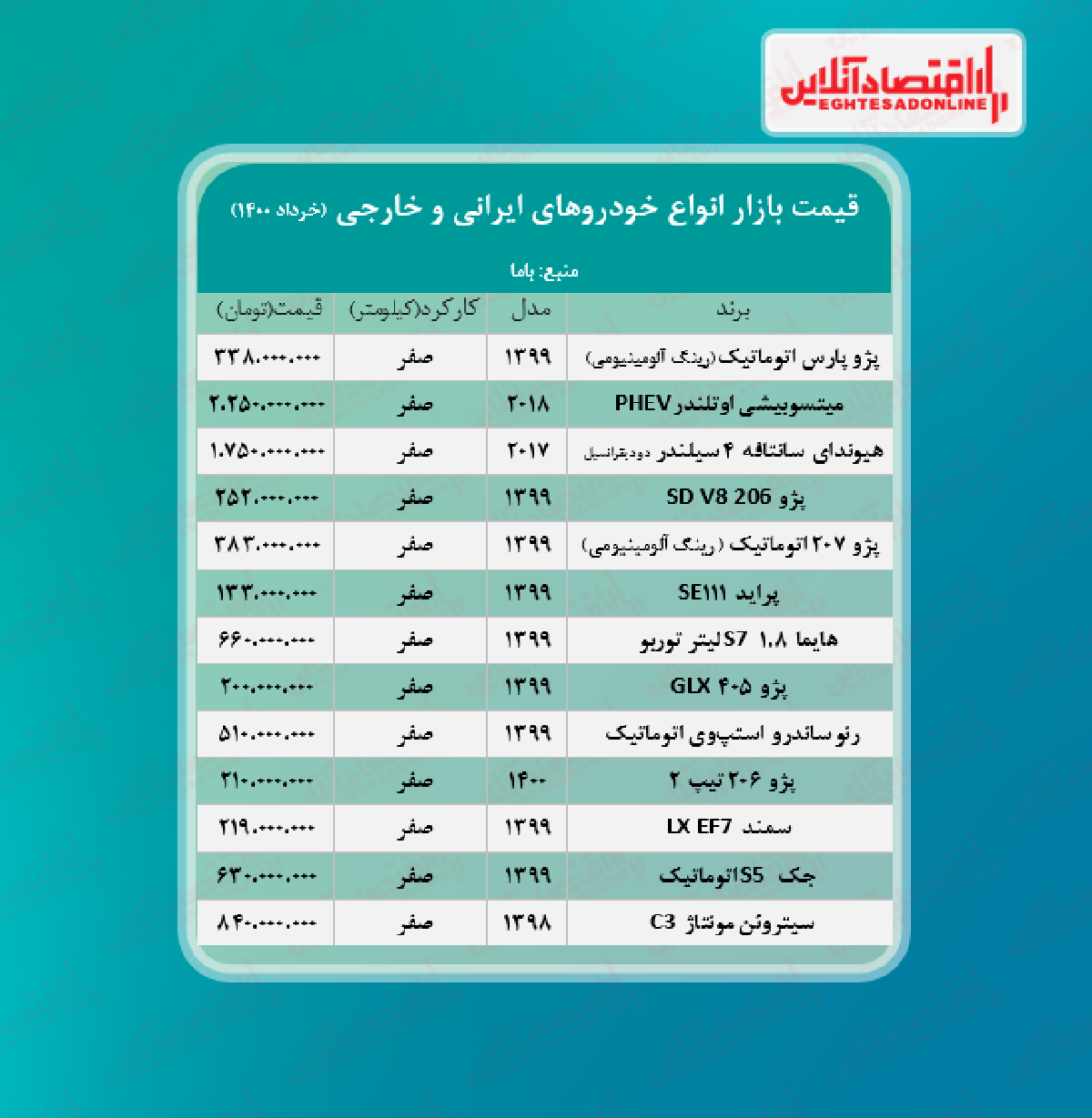 قیمت خودرو امروز ۱۴۰۰/۳/۲۸