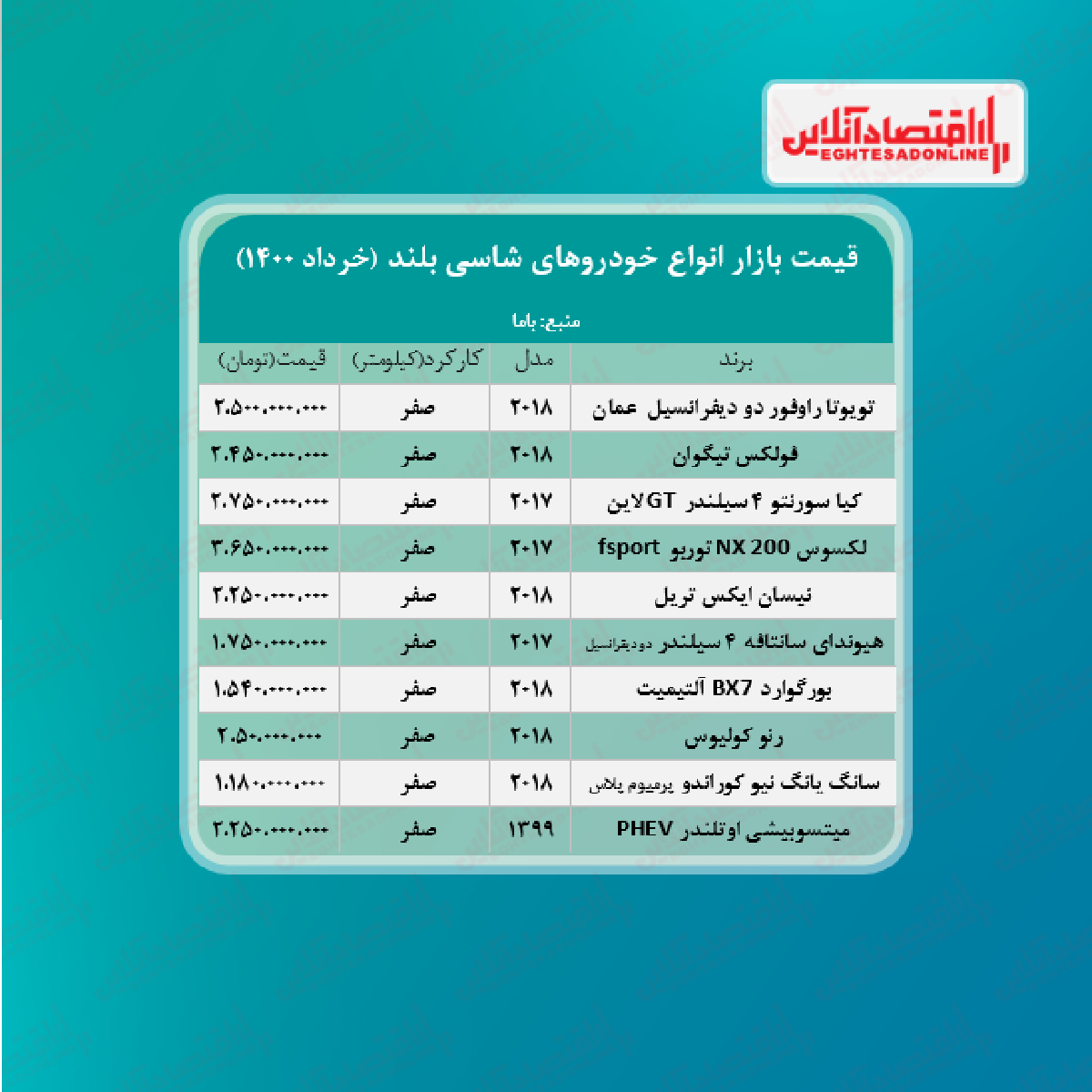 اقتصاد آنلاین - پیام مصطفایی: در جدول زیر قیمت خودروهای شاسی بلند در بازار آزاد را مشاهده میکنید.