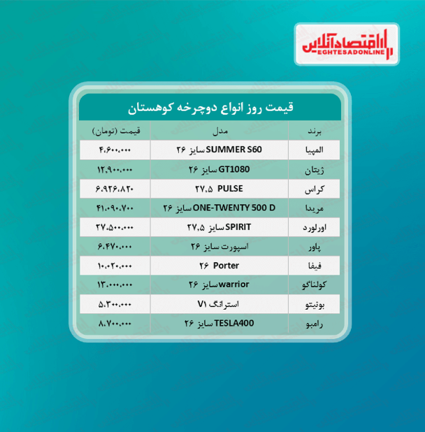 اقتصاد آنلاین -سمانه‌ باقری: آنچه در زیر می‌آید جدول قیمت روز انواع دوچرخه کوهستان در سایت‌های فروش اینترنتی است؛