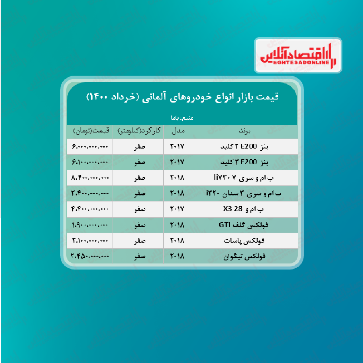 اقتصاد آنلاین - پیام مصطفایی: در جدول زیر قیمت روز خودروهای آلمانی در بازار آزاد را مشاهده میکنید.