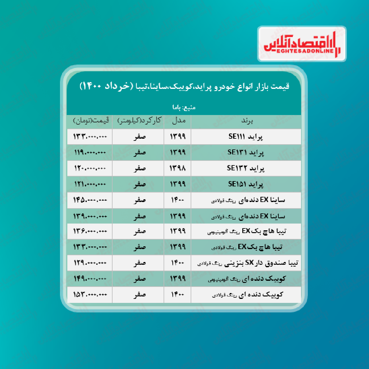 اقتصاد آنلاین - پیام مصطفایی: در جدول زیر قیمت روز انواع پراید، تیبا، کوییک و ساینا در بازار آزاد را مشاهده میکنید.