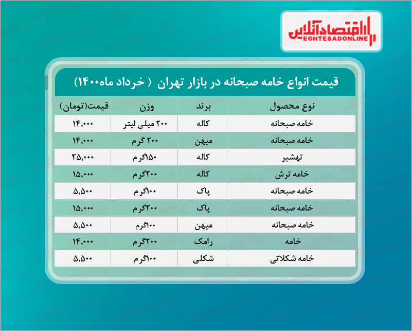 قیمت خامه صبحانه در بازار (خرداد۱۴۰۰) + جدول