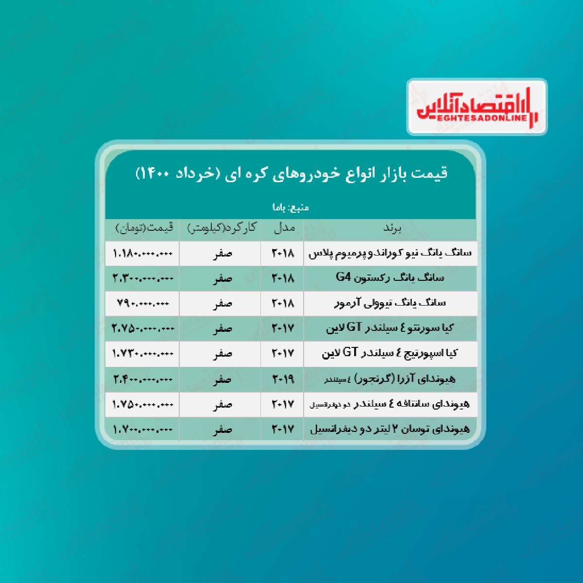 اقتصاد آنلاین - پیام مصطفایی: در جدول زیر قیمت روز انواع خودرو کره‌ای در بازار آزاد را مشاهده می‌کنید.