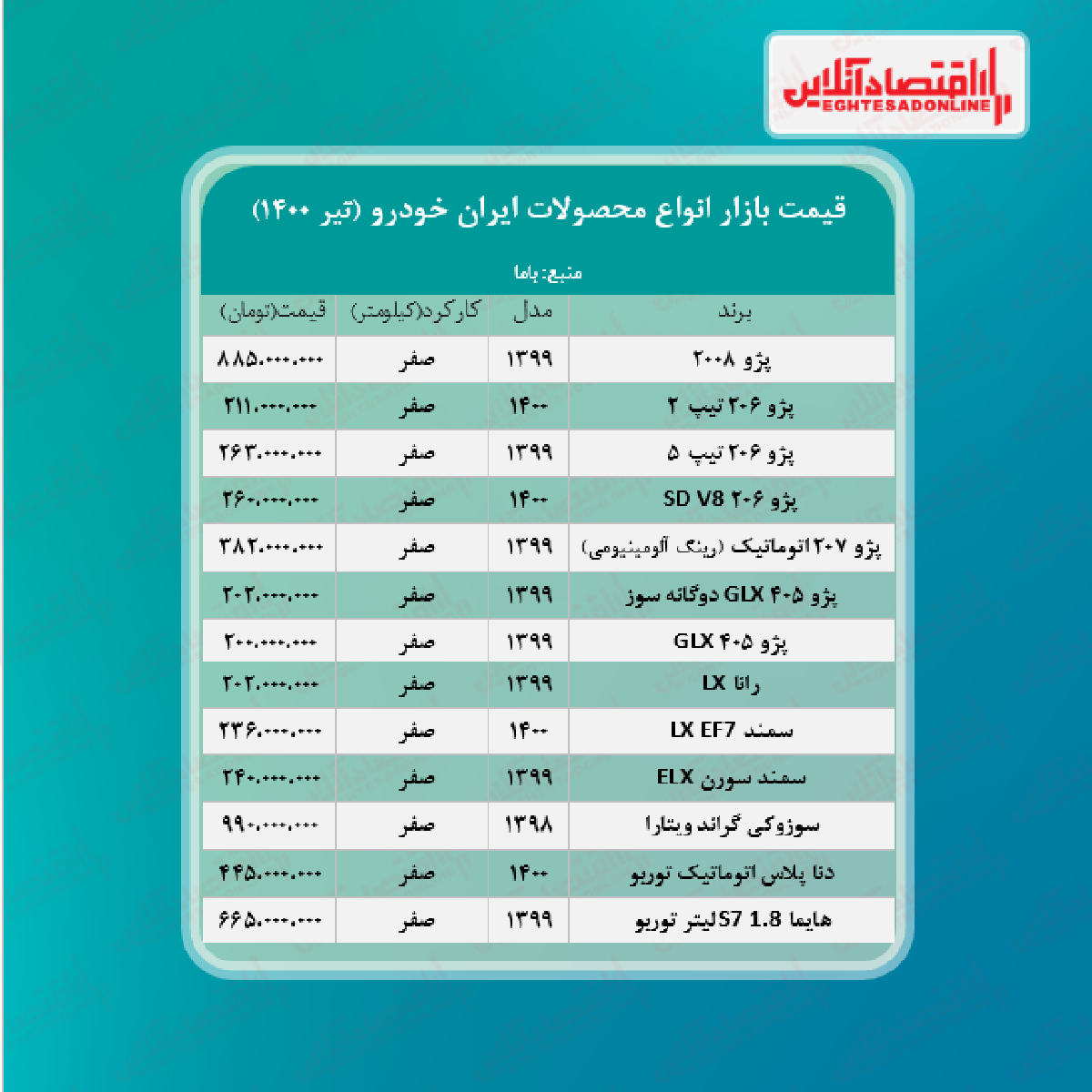 اقتصاد آنلاین - پیام مصطفایی: در جدول زیر قیمت روز محصولات ایران خودرو در بازار آزاد را مشاهده میکنید.