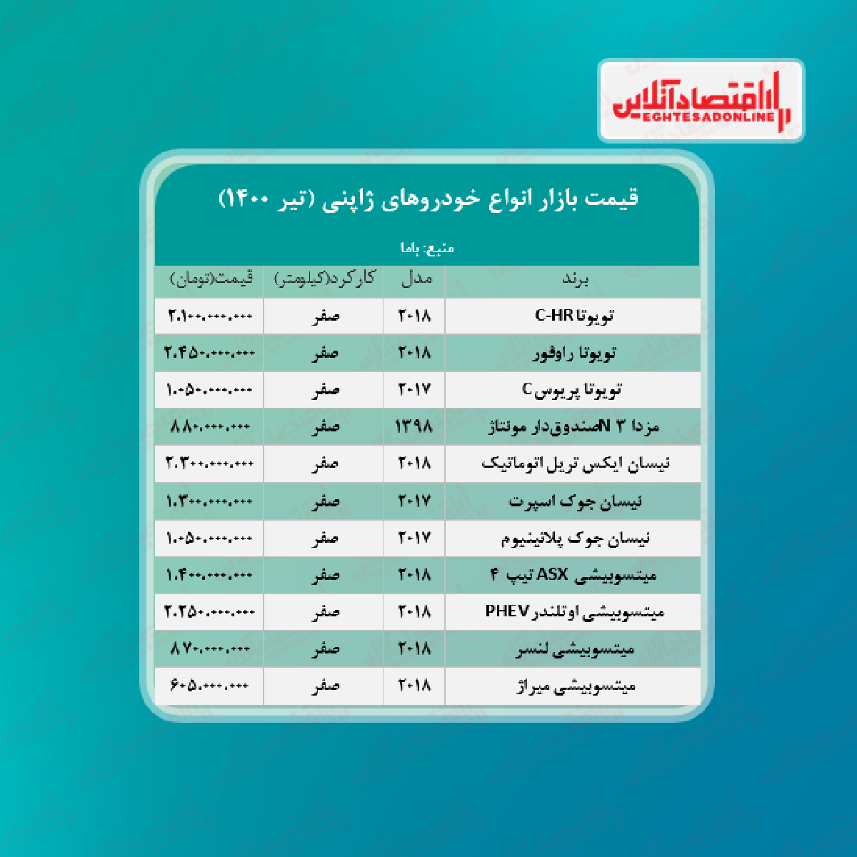 اقتصاد آنلاین - پیام مصطفایی: در جدول زیر قیمت روز انواع خودرو ژاپنی در بازار آزاد را مشاهده می‌کنید.