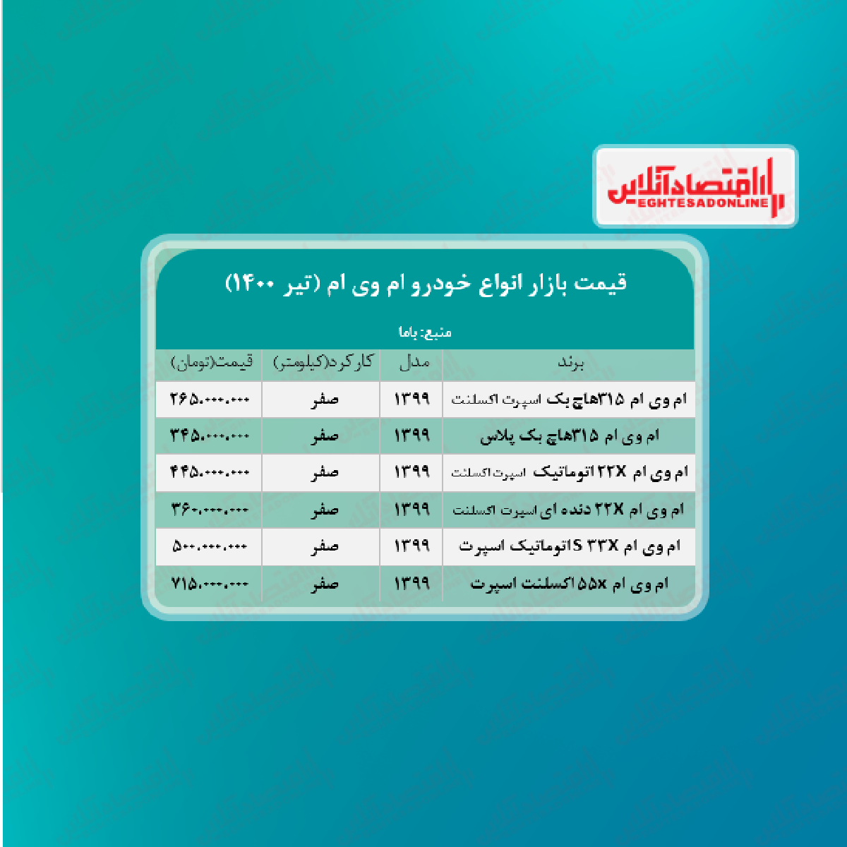 اقتصاد آنلاین - پیام مصطفایی: در جدول زیر قیمت روز انواع ام وی ام در بازار آزاد را مشاهده می‌کنید.