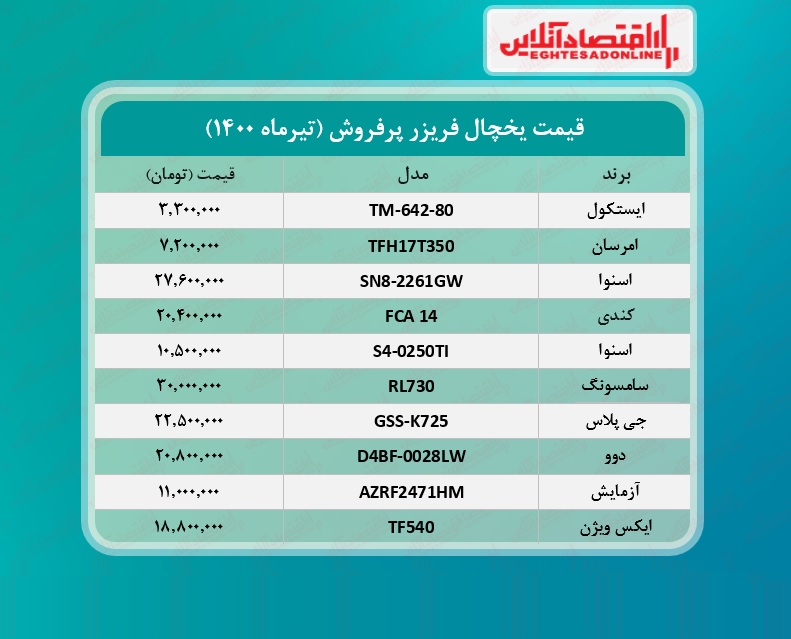 اقتصاد آنلاین - سولماز محمدی: آنچه در زیر می‌آید قیمت یخچال فریزر پرفروش موجود در سطح بازار است؛