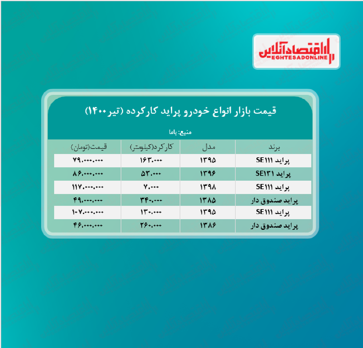 اقتصاد آنلاین - پیام مصطفایی: در جدول زیر قیمت روز انواع پراید کارکرده در بازار آزاد را مشاهده میکنید.