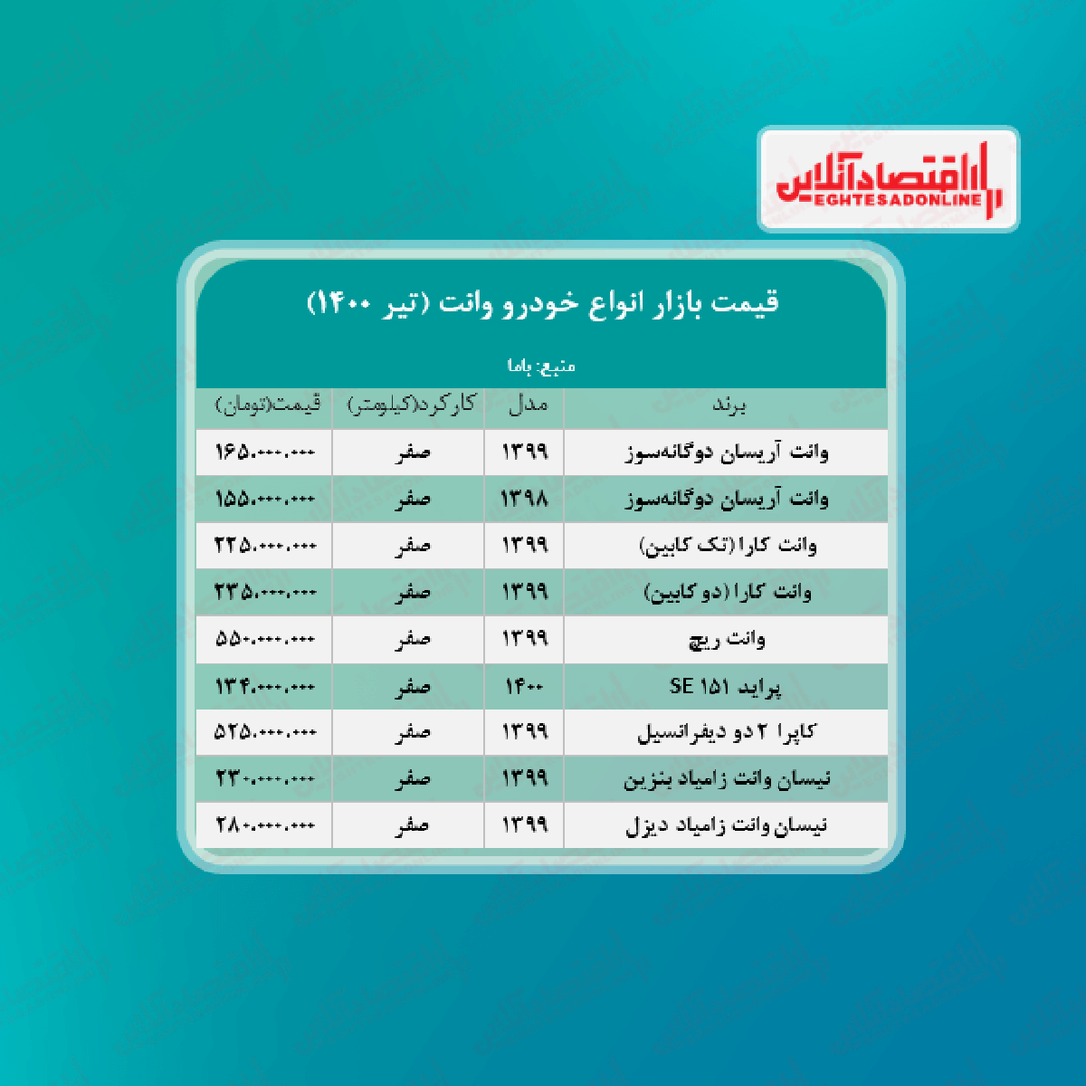 قیمت وانت در هفته دوم تیر ماه + جدول